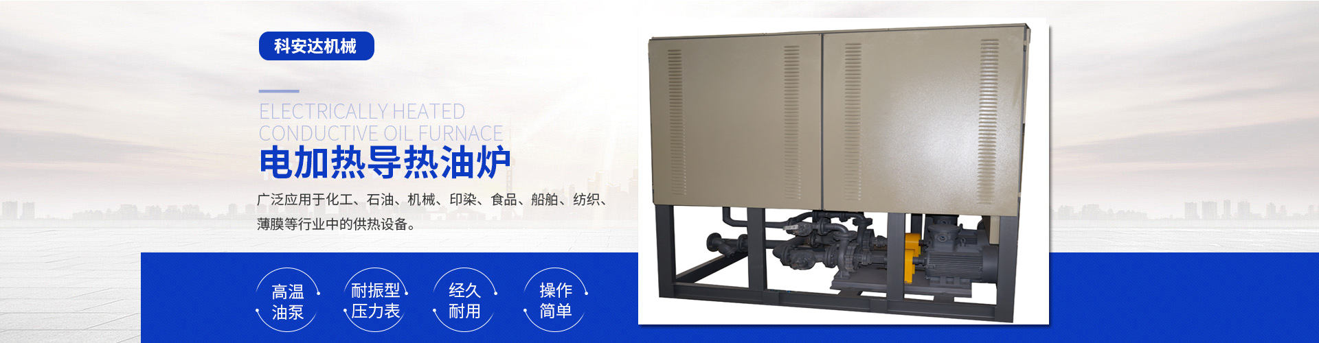 近年來我公司在延用自己的技術基礎上不斷引進先進技術與管理經驗,專業研發制造電加熱導熱油爐(有機熱載體爐)、電磁感應加熱器、電加熱爐、熱風循環箱式預熱爐、風道加熱器、空氣加熱罐、電加熱管、高溫電阻爐、保溫烘箱、烘道、鑄鋁鑄銅加熱器、防爆加熱器、遠紅外加熱管、埋入式遠紅外陶瓷加熱瓦、陶瓷加熱圈、不銹鋼云母電熱圈、碳化硅遠紅外電加熱板、電熱帶 、真空清洗爐、三甘醇清洗爐等。產品適用于化纖、紡織、皮革、塑料機械、電纜機械、食品機械、橡膠機械、冶金、石油、化工、電子、醫療、海洋工程、家用電器等行業。同時可根據客戶使用與現場安裝的需要,設計、制造特殊規格的上述設備,企業以其先進技術、合理的價格,周道的服務使產品遠銷國內外。